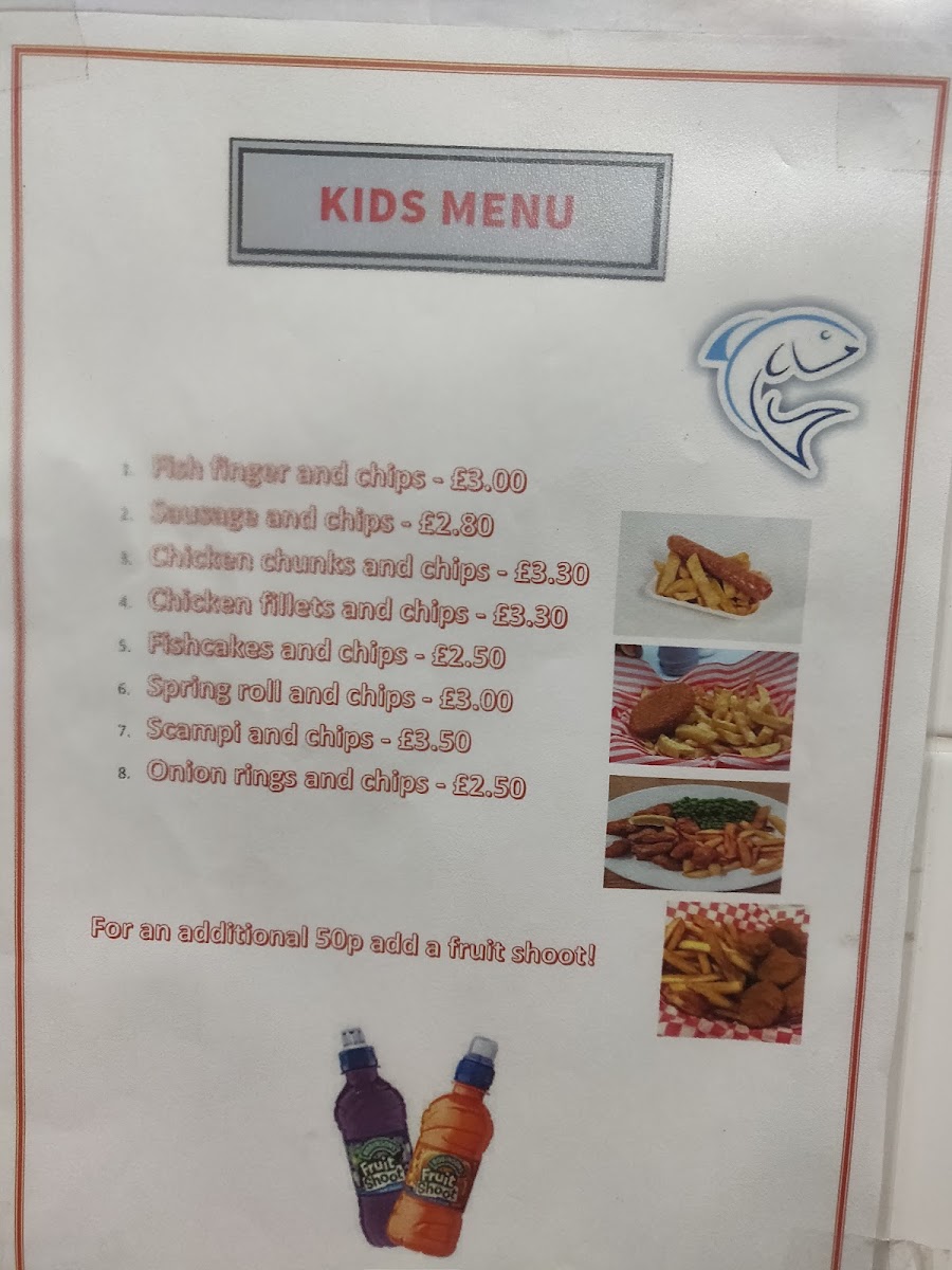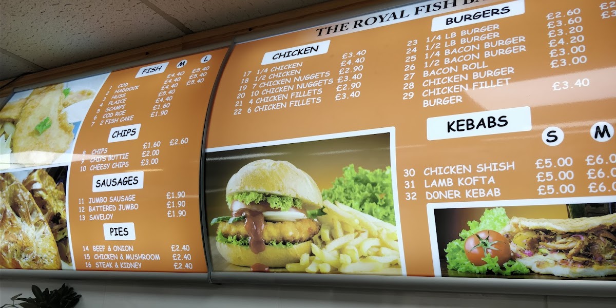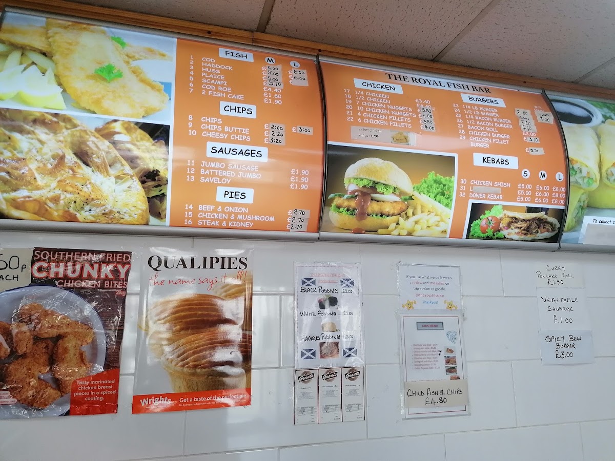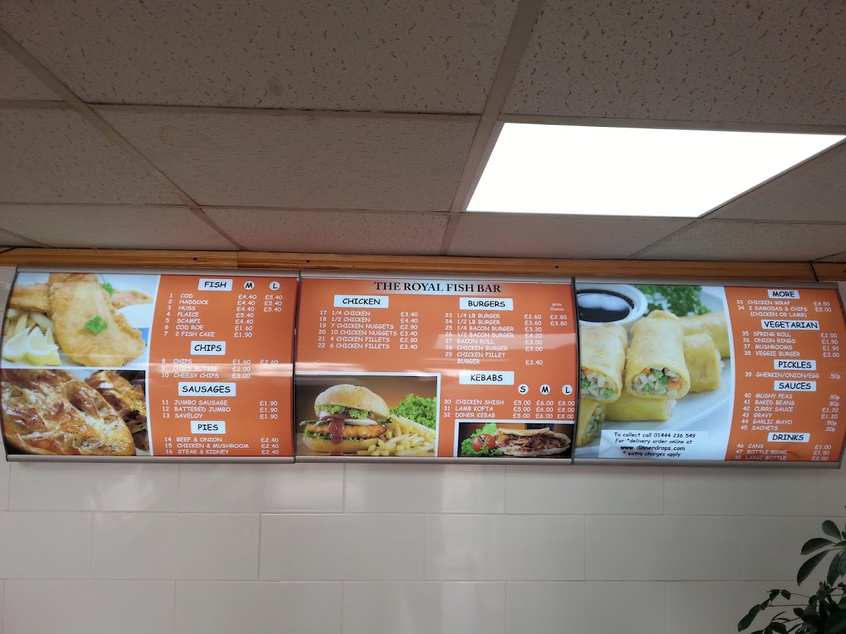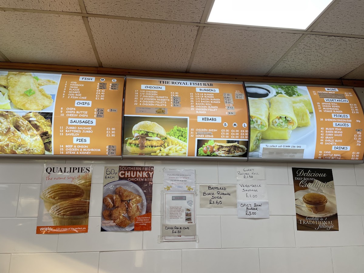 The Royal Fish Bar in Burgess Hill offers a diverse and satisfying menu that caters to various tastes. For those craving seafood, they serve classic options like Haddock, Huss, Plaice, Scampi, and Cod Roe, with Chips available in different styles, such as Chips Buttie and Cheesy Chips. If you’re in the mood for something hearty, their Jumbo Sausage, Battered Jumbo, and Saveloy are popular choices. Pies like Beef & Onion, Chicken & Mushroom, and Steak & Kidney make for a delicious, comforting meal. Chicken lovers can indulge in a variety of options, including 1/4 Chicken, 1/2 Chicken, and 7 or 10 Chicken Nuggets, as well as Chicken Fillets. For those after a burger, the 1/4 Lb Burger, 1/2 Lb Burger, and Bacon Roll are just a few of the many tempting choices. They also offer a Chicken Wrap for something lighter. Vegetarians can enjoy Spring Rolls, Onion Rings, Mushrooms, or the Veggie Burger. A selection of sauces, including Mushy Peas, Baked Beans, Curry Sauce, and Garlic Mayo, adds the perfect finishing touch. If you're after something more substantial, the Chicken Shish, Lamb Kofta, and Doner Kebab are excellent options. For drinks, there are a variety of Cans, 500ml Bottles, and Large Bottles. The kids' menu features favorites like Fish Finger and Chips and Chicken Chunks and Chips, ensuring little ones have plenty of delicious options to choose from. Whether you're in the mood for a classic fish and chips meal, a tasty burger, or something with a bit more flair, The Royal Fish Bar offers a wide array of choices sure to satisfy any craving.